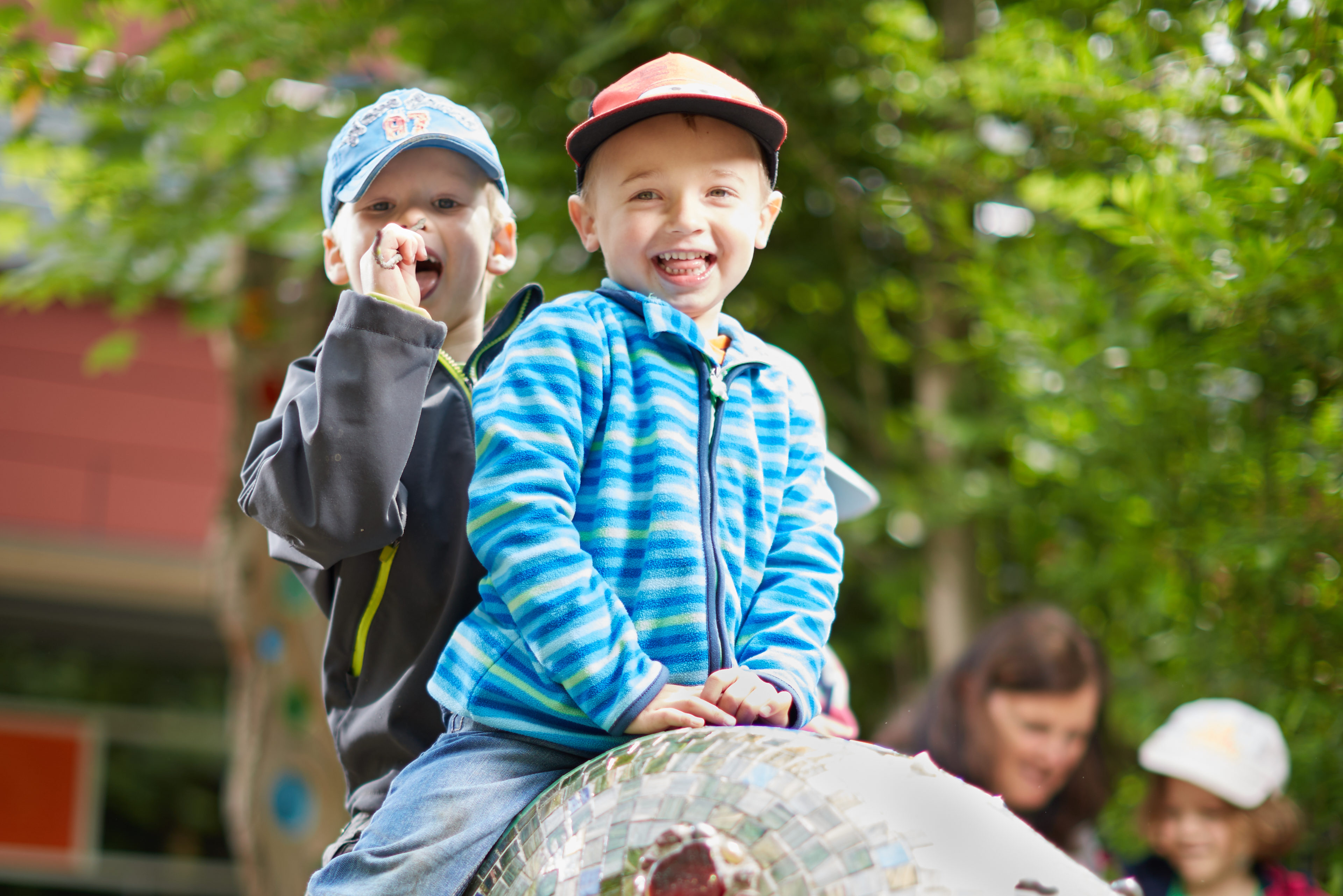 Klassische Spielgeräte sind im Bereich der Großen die Ausnahme. Die Jungen und Mädchen klettern auf Bäume, reiten auf einem mit bunten Mosaiksteinen verzierten Steindrachen, spielen im großen Tipi Indianer oder lauschen am flackernden Lagerfeuer einem Märchen. „Die Kinder dürfen in einem geschützten Raum abenteuerliche und fantasievolle Dinge erleben“, sagt Gaby Lindinger, Leiterin der Kita. Ihr ist wichtig, dass die Kinder in der Natur mit allen Sinnen angesprochen werden.