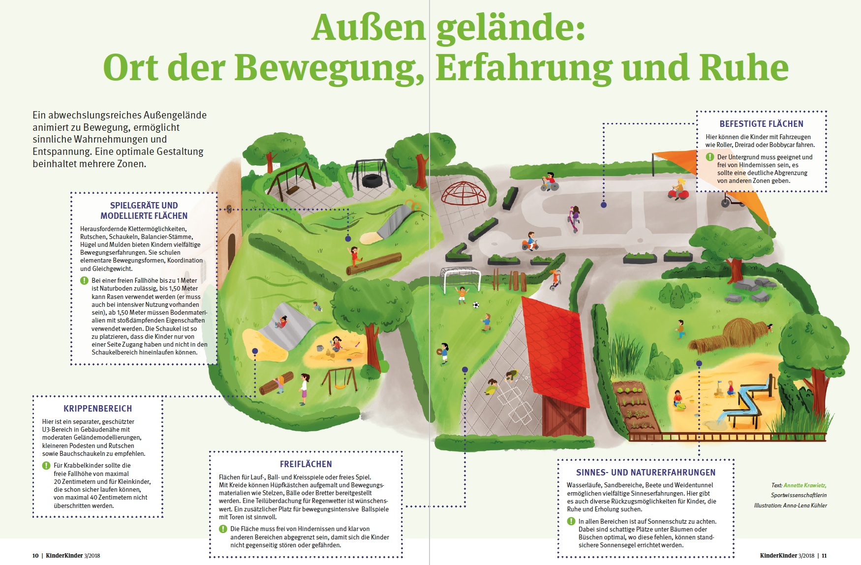 Ein abwechslungsreiches Außengelände animiert zu Bewegung, ermöglicht sinnliche Wahrnehmungen und Entspannung. Eine optimale Gestaltung beinhaltet mehrere Zonen.