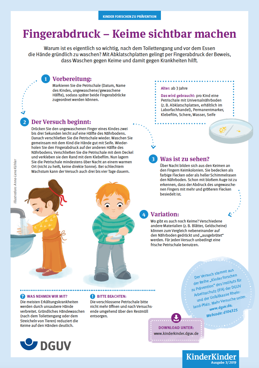 Warum ist es eigentlich so wichtig, nach dem Toilettengang und vor dem Essen die Hände gründlich zu waschen? Mit Abklatschplatten gelingt per Fingerabdruck der Beweis, dass Waschen gegen Keime und damit gegen Krankheiten hilft.