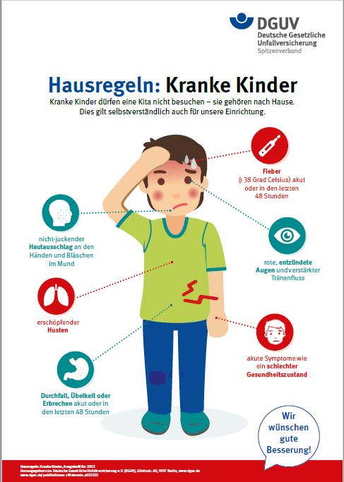Kranke Kinder dürfen eine Kita laut Infektionschutzgesetz nicht besuchen – sie gehören nach Hause. In einer Kita gilt ein Kind als krank, wenn es eines oder mehrere der folgenden Symptome zeigt. Unser Aushang dazu in Deutsch, Englisch, Französisch, Türkisch, Arabisch, Russisch und Ukrainisch.