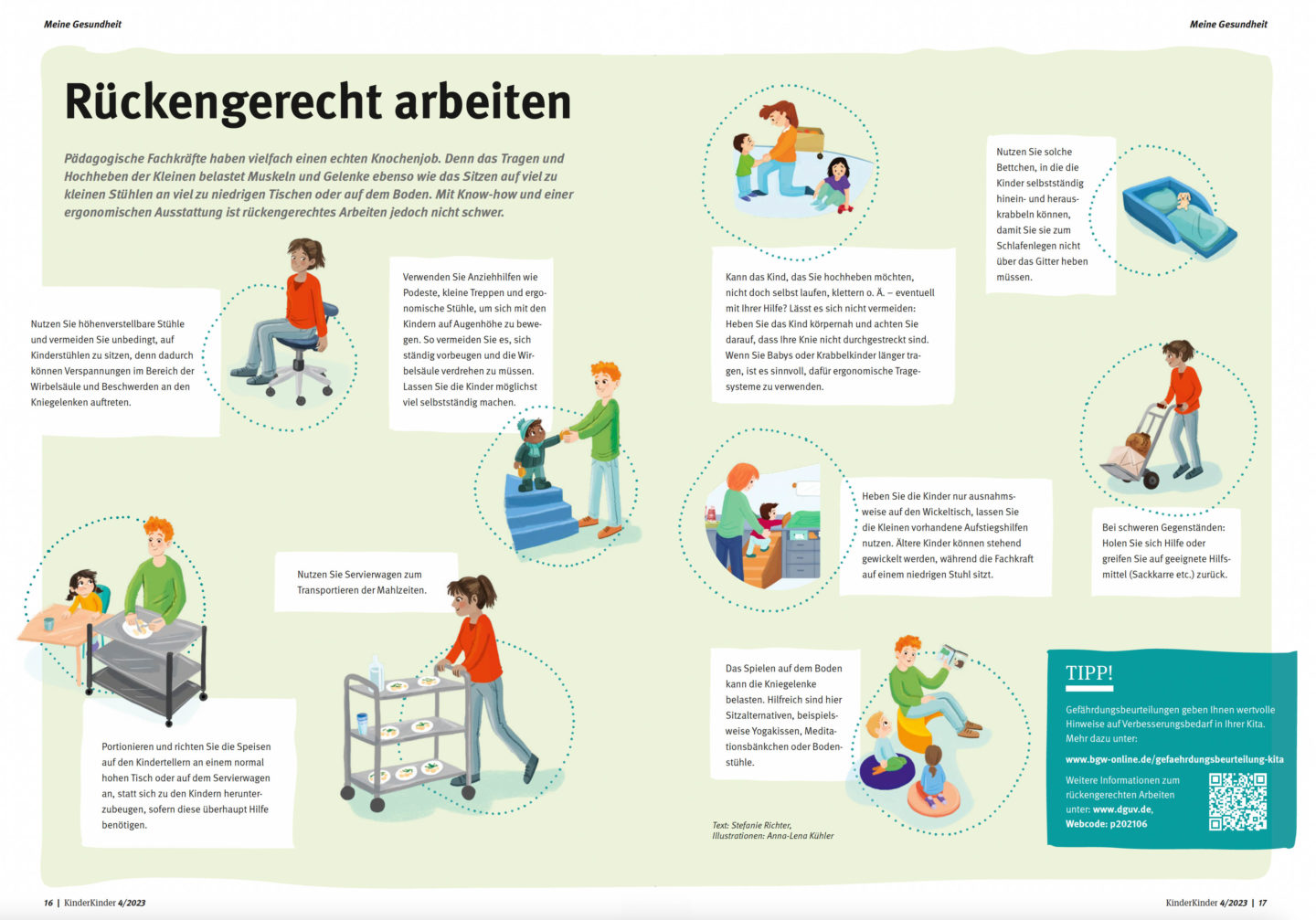 Stühle, um sich mit den Kindern auf Augenhöhe zu bewegen. So vermeiden Sie es, sich ständig vorbeugen und die Wirbelsäule verdrehen zu müssen. Lassen Sie die Kinder möglichst viel selbstständig machen. - Nutzen Sie Servierwagen zum Transportieren der Mahlzeiten.