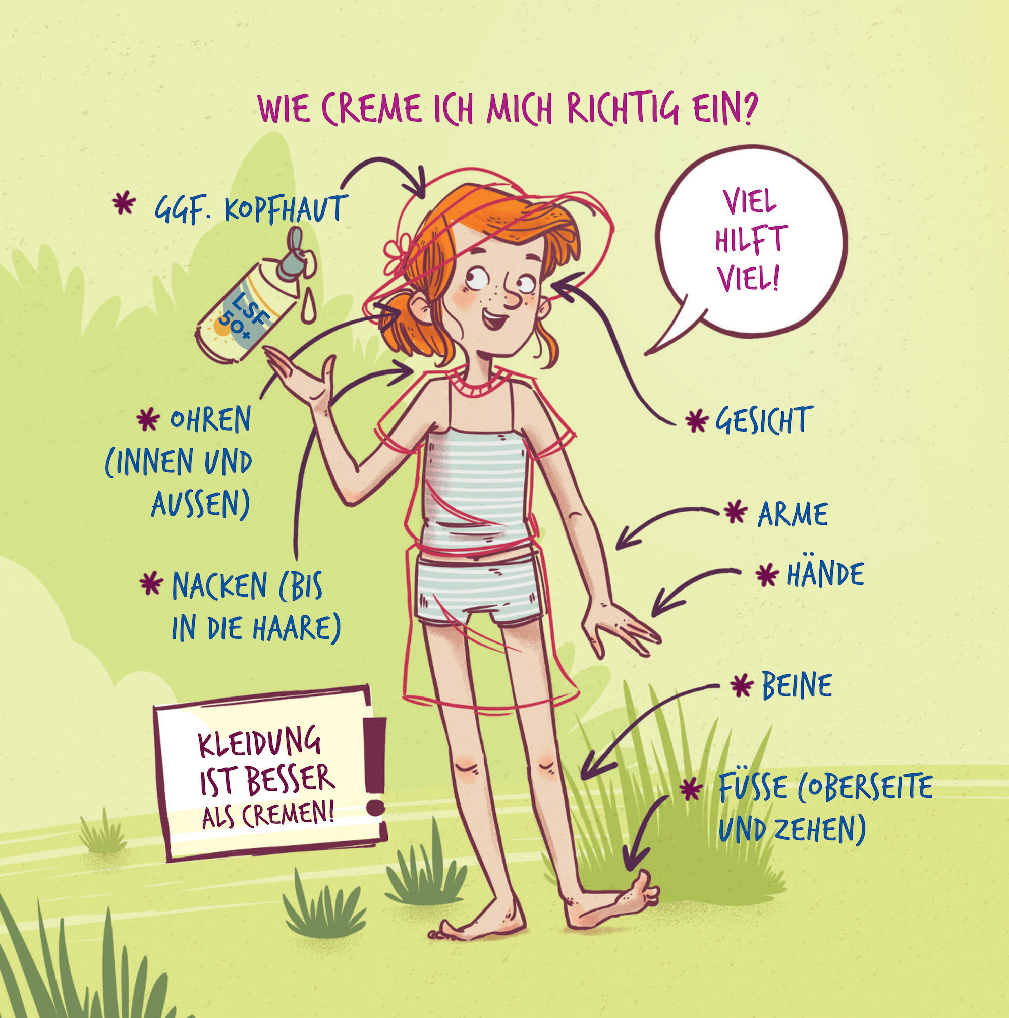 - Stirn, Ohren, Nase, Lippen, Kinn, Schultern und Fußrücken gründlich eincremen; sie sind „Sonnenterrassen“
