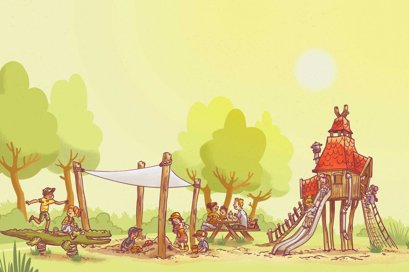 - Spielbereiche auf dem Außengelände abschatten oder in den Schatten verlegen, z.B. unter:
