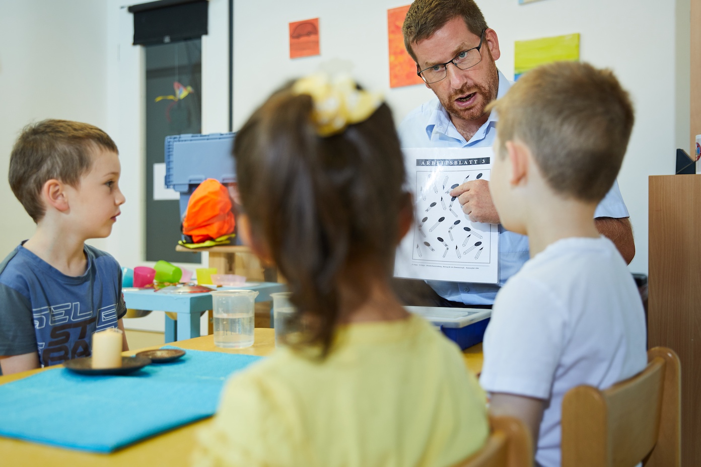 Nachdem alle Kinder das Streichholz- und Kerzenanzünden ausprobiert haben, steht ein neues Experiment an. Auf einer nicht brennbaren Unterlage sollen Alltagsgegenstände auf ihr Brennverhalten getestet werden. Dazu ist extra der Brandschutzbeauftragte von der Feuerwehr, Sebastian Schmitt, in die Kita gekommen. „Was glaubt ihr? Brennt dieser Stein?“, fragt er die Kinder. „Nein!“, tönt es vielstimmig, Letizia kichert. Steine brennen doch nicht. Schmitt versucht, den Stein anzuzünden. Vergebens. „Da hattet ihr recht. Aber was ist mit Pappe?“ Theo weiß es: „Pappe brennt!“ Das wird direkt ausprobiert. Und richtig, sie fängt Feuer. Genau wie die dünne Serviette, die regelrecht auflodert. Große Augen bei den Kindern.