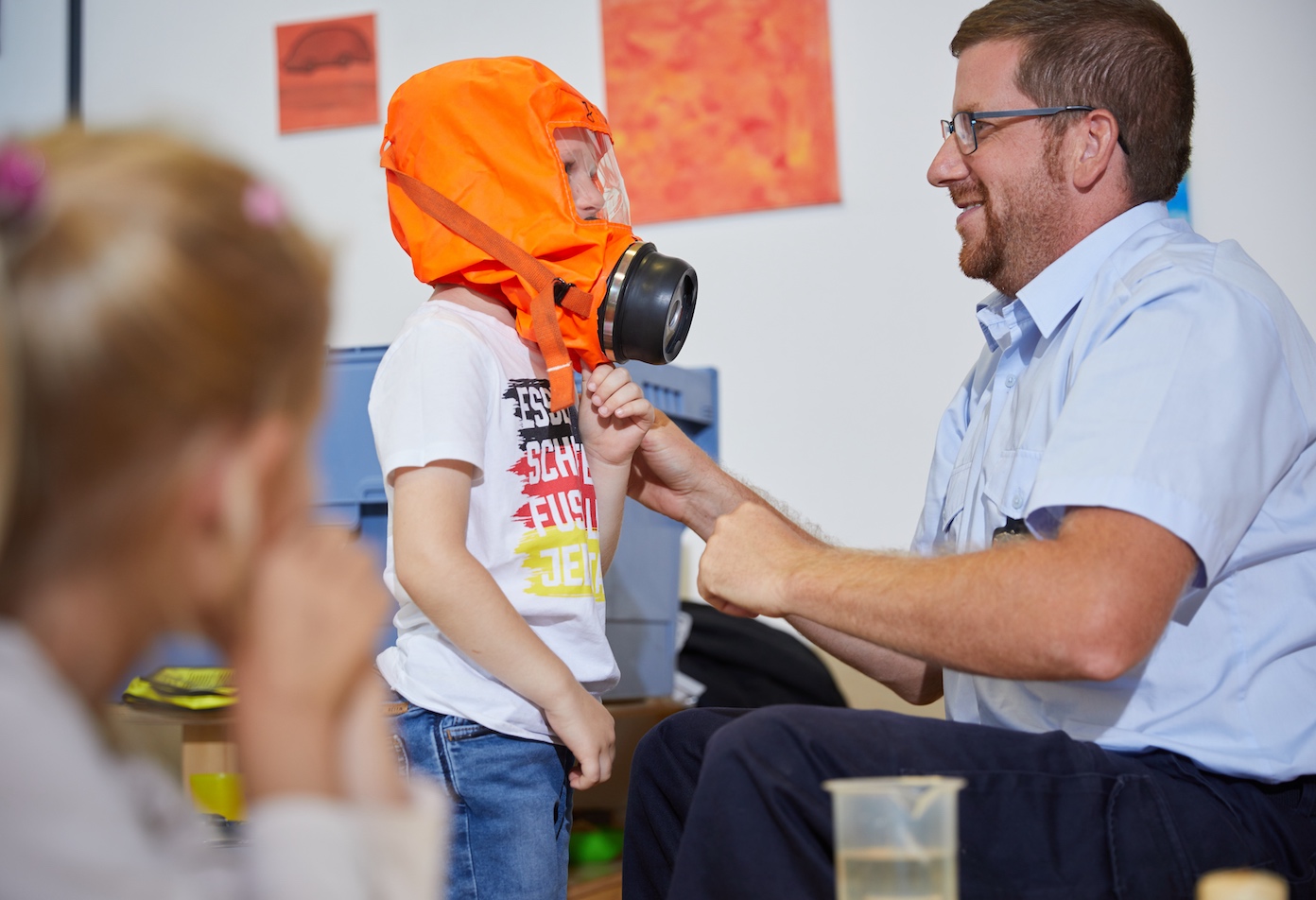 So testen sich Schmitt und die „Detektive“ durch eine ganze Reihe Materialien. „Die Kinder bekommen so einen Überblick, welche Materialien leicht und welche schwer entflammbar sind.“ Vertieft wird dieses Wissen mit kleinen Rätselaufgaben und Ausmalbildern. Ruhig beantwortet Schmitt jede Frage – und die „Detektive“ sind als richtige Spürnasen äußerst wissbegierig.