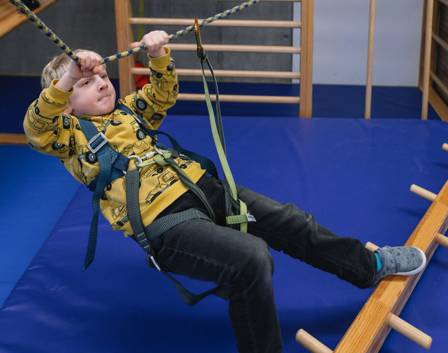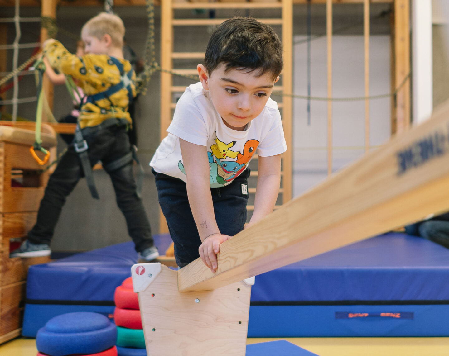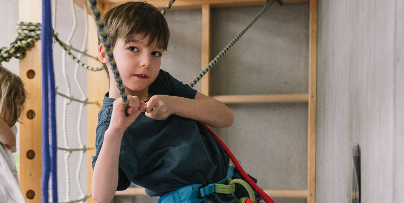 Zurück im Bewegungsraum. Dort dürfen sich die Kinder wie kleine Bergsteigerinnen und Bergsteiger fühlen. So toll Schwingschaukel oder Wippe auch sind – die Kletterlandschaft ist heute das Highlight. Über einen Kasten und eine schräge Ebene machen sich die Mädchen und Jungen auf den Weg zur Sprossenwand. Die könnte genauso gut die Eiger-Nordwand sein. Jedenfalls stecken die Nachwuchs-Messners in professionellen Klettergurten, an denen Seile mit Karabinerhaken befestigt sind. Am „Gipfel“ angekommen sichern sie sich und balancieren über ein Seil. Ein großes Abenteuer in 1.500 … ach nein … doch nur eineinhalb Meter Höhe.