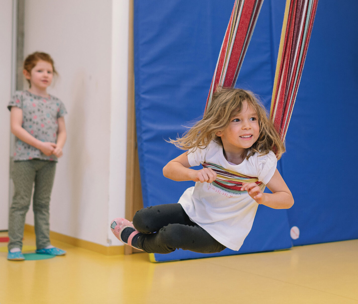 Alessio hätte die Matten nicht gebraucht. Trotz wildestem Schaukeln sitzt der Junge sicher im Hängemattentuch. Dafür allerdings fliegt ihm einer seiner Gymnastikschuhe vom Fuß. Lilly, die später auch wild schaukelt, macht sich sofort auf den Weg, um den Schlappen zu holen. Dazu muss sie die Flugbahn kreuzen, passt aber richtig gut auf. Auch Alessio hat seine Spielkameradin im Blick. Tamara Klos-Walter steht etwas abseits des Geschehens, lässt die Kinder gewähren, hat die Szene jedoch genau im Blick und greift nur im Notfall ein. „Meine Aufgabe ist das Beobachten. Die Kinder sollen selbst lernen, umsichtig zu sein. Das ist ja zum Beispiel auch im Straßenverkehr wichtig“, erklärt die Erzieherin.