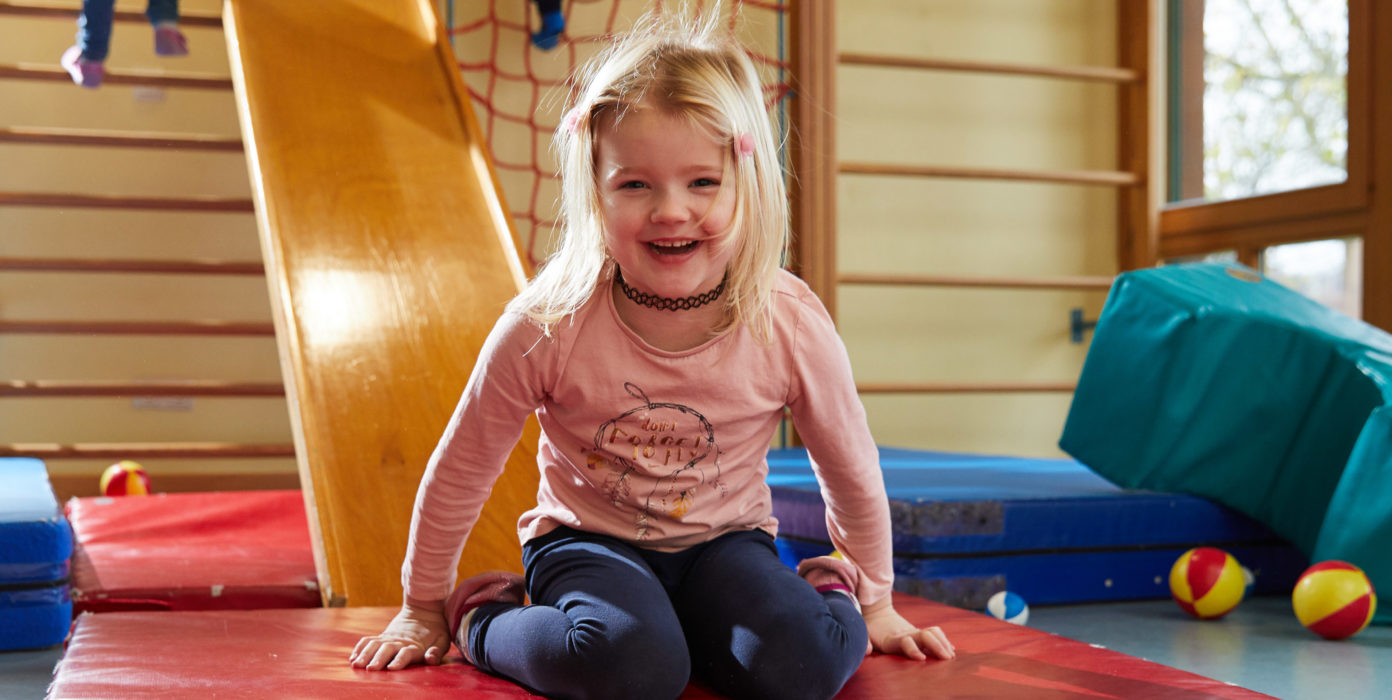Heute ist was los: Lina baut konzentriert mit den riesigen Bausteinen ein Flugzeug, Luisa schaukelt und wippt auf dem Schaumstoffring und die Jungs wetteifern, wer von ihnen am schnellsten die Rutsche hoch- und runterkommt. Malte hängt am Kletternetz und macht Faxen. Im Turnraum der Kita Argenthal bei Simmern in Rheinland-Pfalz gibt es Platz und Material für viel Bewegung. Klettern, hopsen, werfen, balancieren – alles ist möglich. Die Kinder können die meiste Zeit des Tages den Raum frei nutzen. „Das geht jetzt wieder“, freut sich Kitaleiterin Dajana Bartelmann-Henke. „Während Corona war hier auch ein Gruppenraum, da wir gezwungen waren, vom offenen Konzept in geschlossene Gruppen zu wechseln“, erklärt sie. „Das hat uns ziemlich eingeschränkt.“