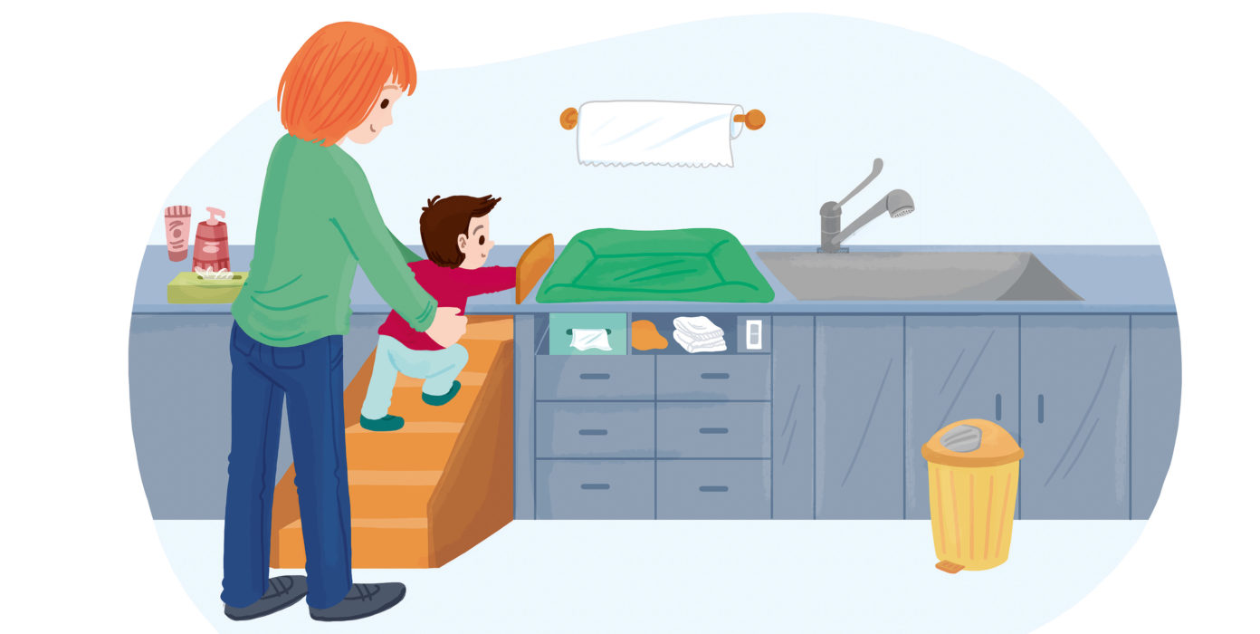 Sind die Wickeltische im Waschraum frei zugänglich, müssen Aufstiegshilfen gesichert werden, damit Kinder nicht unbeobachtet hochklettern können.