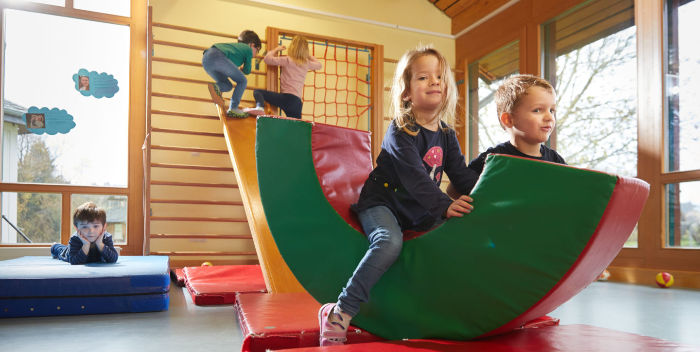 Heute ist was los: Lina baut konzentriert mit den riesigen Bausteinen ein Flugzeug, Luisa schaukelt und wippt auf dem Schaumstoffring und die Jungs wetteifern, wer von ihnen am schnellsten die Rutsche hoch- und runterkommt. Malte hängt am Kletternetz und macht Faxen. Im Turnraum der Kita Argenthal bei Simmern in Rheinland-Pfalz gibt es Platz und Material für viel Bewegung. Klettern, hopsen, werfen, balancieren – alles ist möglich. Die Kinder können die meiste Zeit des Tages den Raum frei nutzen. „Das geht jetzt wieder“, freut sich Kitaleiterin Dajana Bartelmann-Henke. „Während Corona war hier auch ein Gruppenraum, da wir gezwungen waren, vom offenen Konzept in geschlossene Gruppen zu wechseln“, erklärt sie. „Das hat uns ziemlich eingeschränkt.“