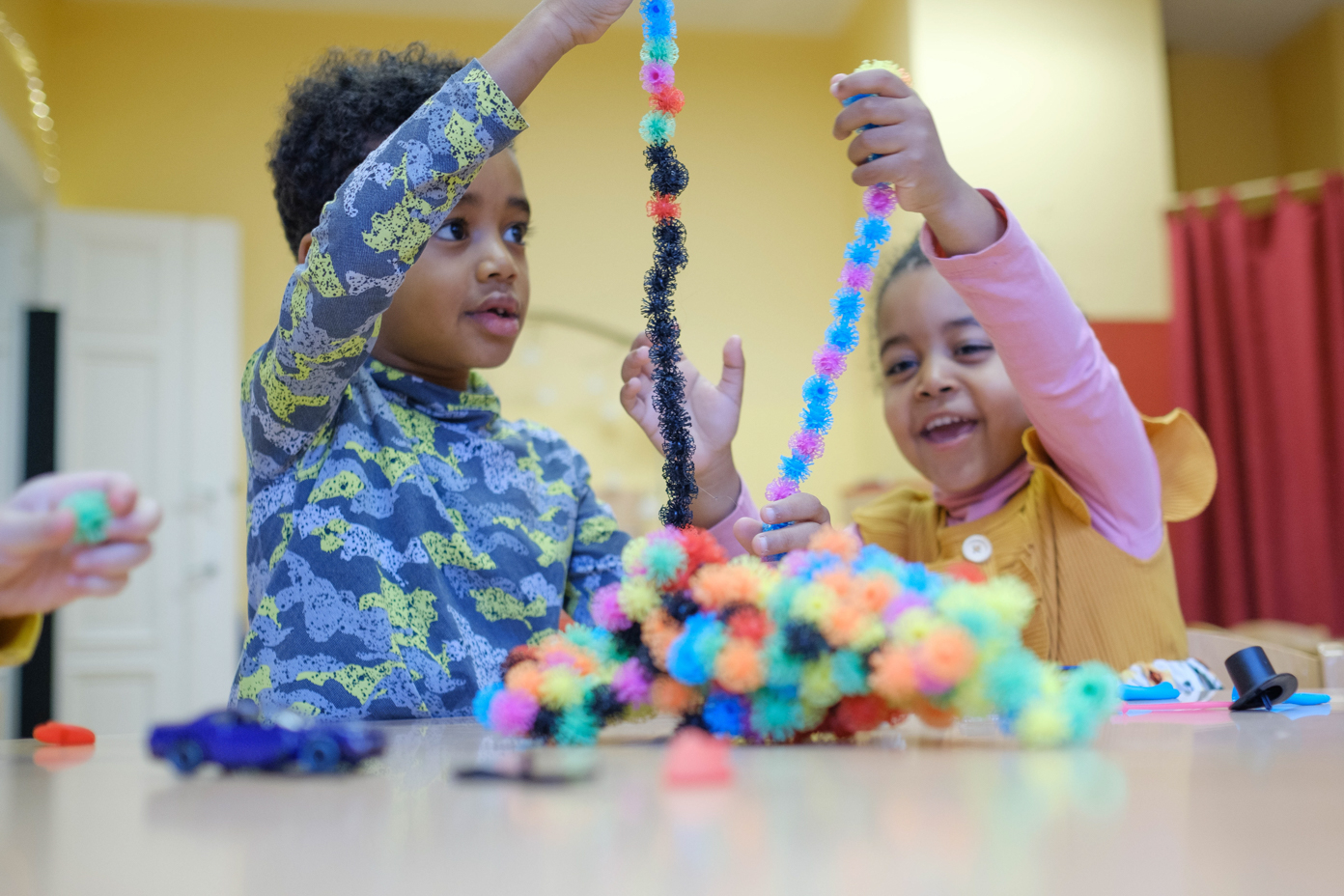 Das Weltkinderhaus arbeitet auf zwei Etagen nach dem offenen Konzept. Die Kinder können also recht frei zwischen den Themenräumen wählen. Mal spielen sie im Familienzimmer mit der Kinderküchenzeile oder dem Kaufmannsladen, mal konstruieren sie im Bauraum mit Lego, Duplo oder Holzbausteinen, dann verkleiden sie sich im Märchen- und Musikzimmer. Vieles, wie zum Beispiel das Spielzeug, ist in den Räumen mehrsprachig beschriftet. Außerdem gibt es eine kleine Bibliothek mit zweisprachigen Kinderbüchern. Studierende der örtlichen Hochschule kommen regelmäßig in die Kita und lesen vor, abwechselnd in Deutsch und in ihrer Muttersprache. Dieses Tandemlesen fördert den Spracherwerb.