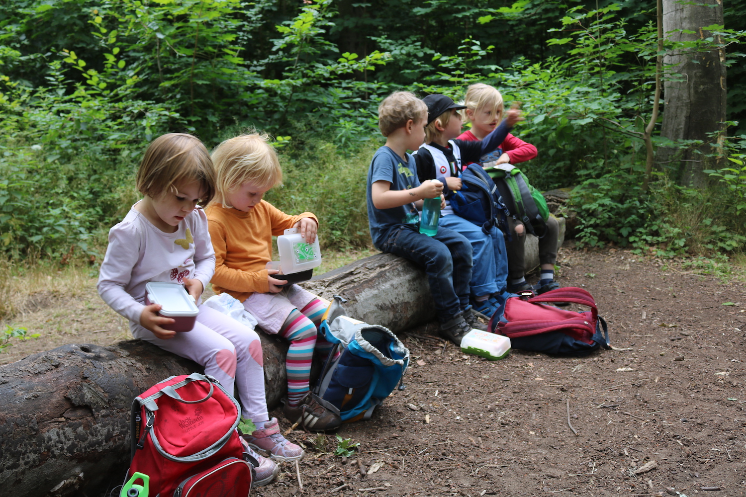 Ihr Essen und Trinken bringen die Kinder dafür im Rucksack mit in den Wald. Zusätzlich haben die Erzieherinnen und Erzieher etwas Brot, ein bisschen Obst, Gemüse und Trinkwasser dabei. Wenn es regnet, schützen zwei Tarps (Outdoorplanen) oder das Überdach am Waldspielplatz. Lange Hosen und Ärmel sind Pflicht. Wechselsachen, Sonnenschutz, Käppi sind immer dabei. Zum Schutz vor Zecken wird Schwarzkümmelöl auf die Kleidung aufgetragen. Ein Handy sowie ein Erste-Hilfe-Set gehören zur Ausrüstung.