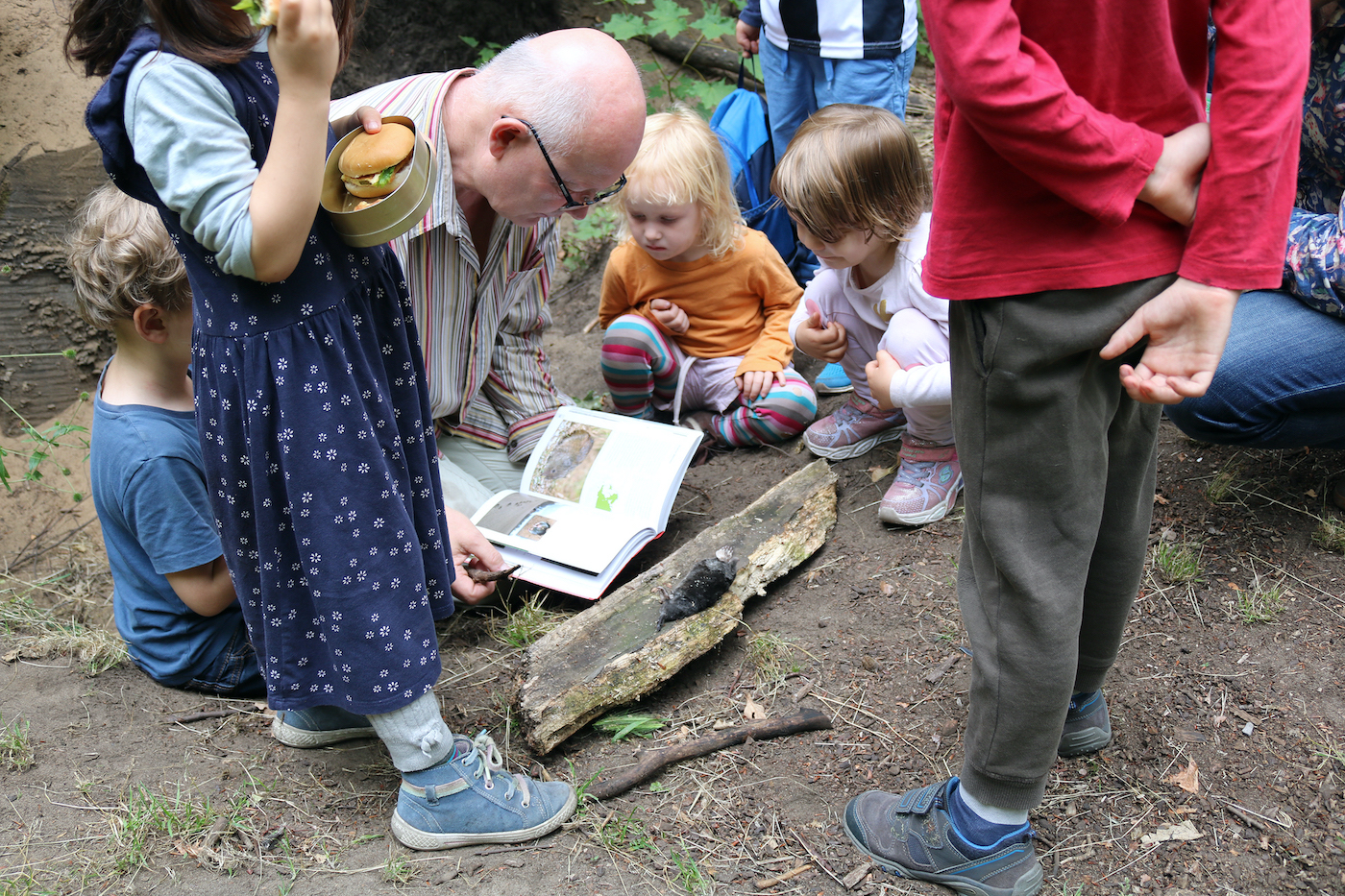 Der Wald fördert die Kreativität der Kinder. Sie bauen Holzzelte, rühren Holunderseife oder schnitzen Rohrflöten. An diesem Tag finden sie einen toten Maulwurf. Wie groß die Schaufeln sind! „Der hat ja keine Augen!“, ist eines der Kinder erstaunt. Im Buch „Tierspuren“ finden sie heraus, was Maulwürfe fressen, wie „Maulwurfkacka“ aussieht, dass die Tiere fast blind sind und mit ihren Schaufeln lange Gänge in die Erde graben. „Warum wohnt er in der Erde? Warum ist er gestorben?“, fragen sie Andreas Schönefeld. Gemeinsam suchen sie einen ruhigen Platz, um ihn zu beerdigen. Wie selbstverständlich erfahren Frida, Paul und die anderen die Natur. Sie erleben Tiere und Pflanzen in ihren ursprünglichen Lebensräumen und sammeln ganzheitliche Erfahrungen.